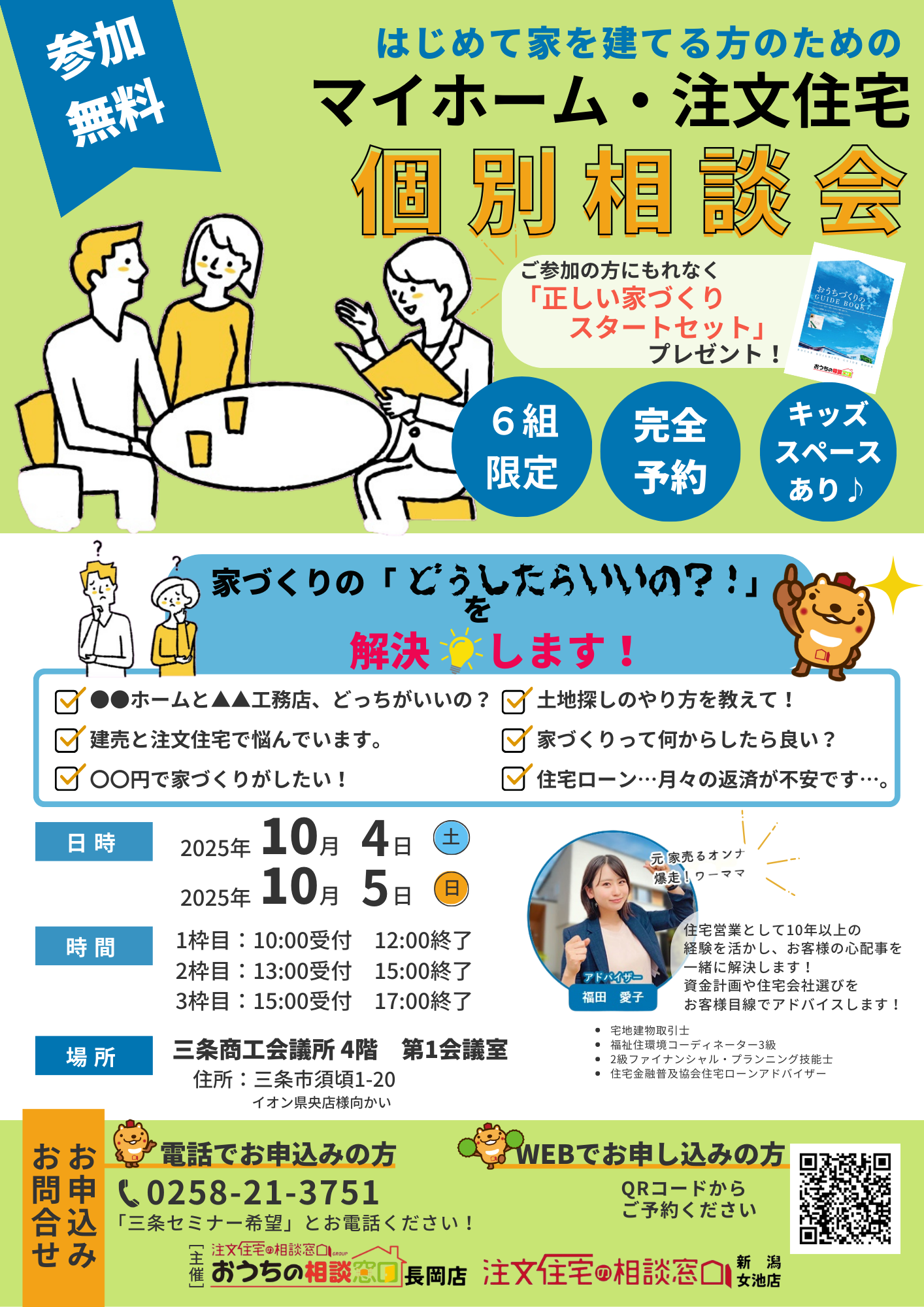 2025年10月4日(土)10月5日(日)三条エリア出張!はじめて家を建てる方のマイホーム・注文住宅 個別相談会開催!