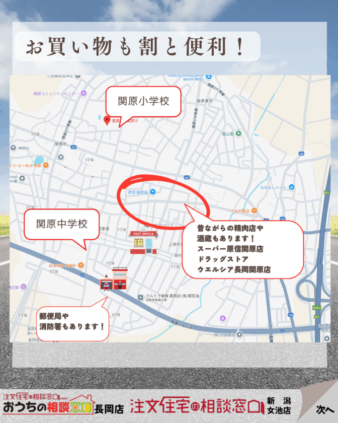 スーパー原信関原店や、ドラッグストアウエルシア長岡関原店